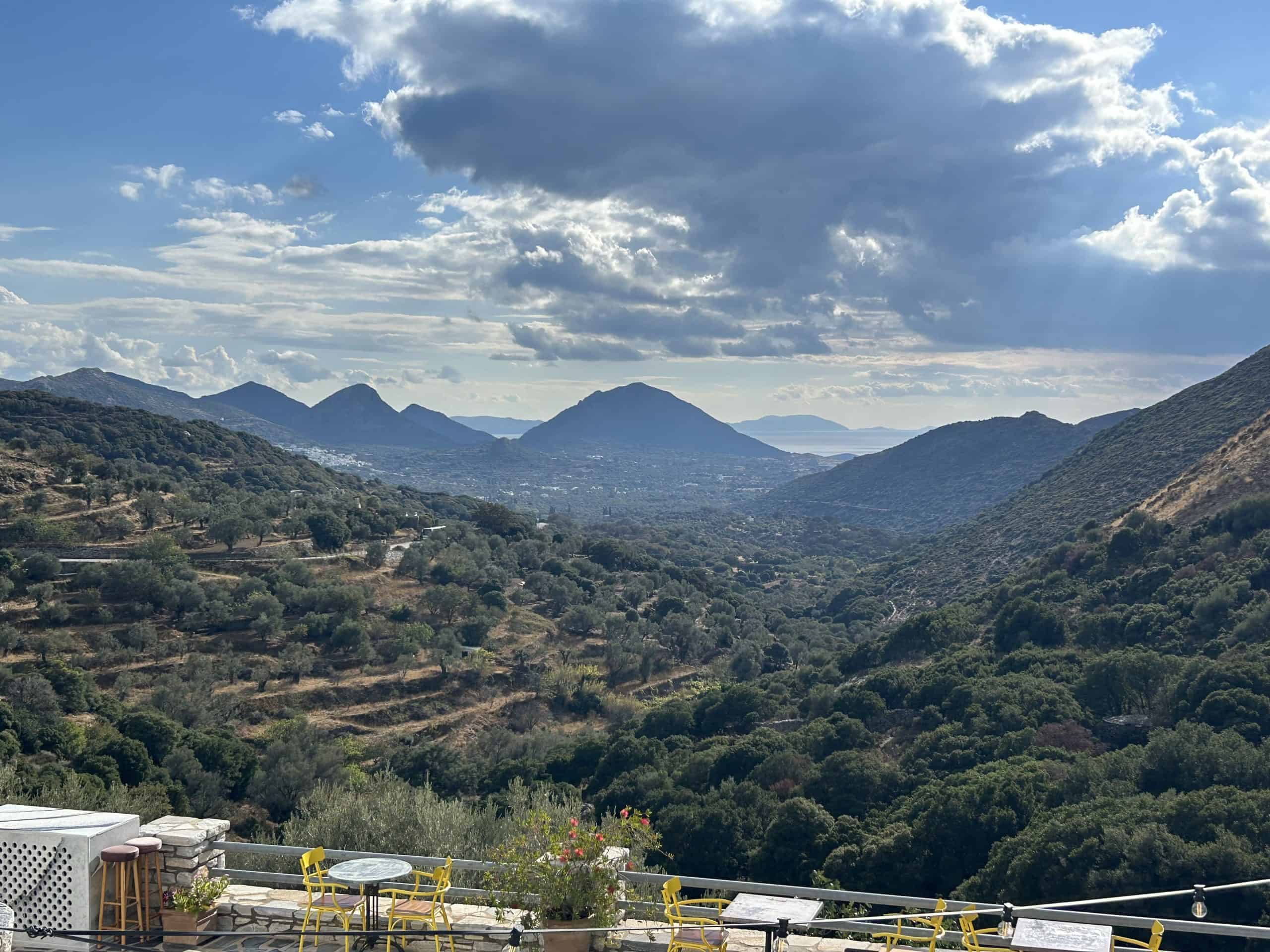 From the terrace, sweeping views extend across green valleys, mountain landscapes, and the distant Aegean horizon. These vistas become part of the retreat experience itself, inspiring conversation, contemplation, and quiet moments of presence.